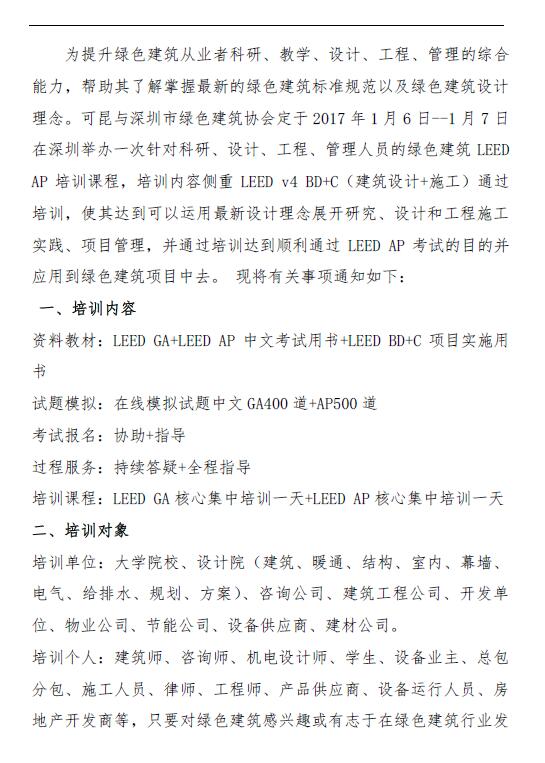 LEED 最新V4版中文考试培训报名通知(2017年1月6-7日)
