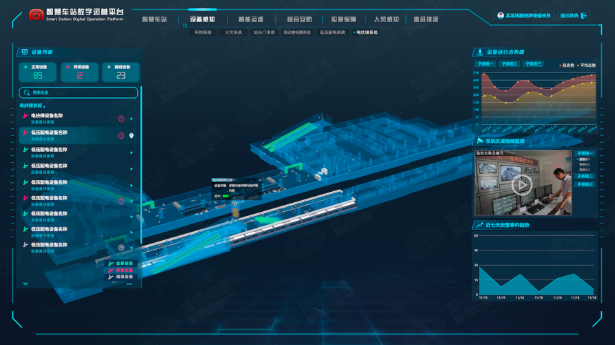 以观讯信息自主研发的智慧车站三维综合管理平台,以车站的BIM和GIS三维数据作为基础数据,与车站的各为联网数据进行基础,实现三维可视化的动态管理。主要集成了视频监控系统、安检系统、AFC系统、电梯控制系统、门禁系统、智慧消防系统、智能环控系统、能耗分析等系统。实现车站运营对设备、环境、能耗、客人、安检的实时监测。