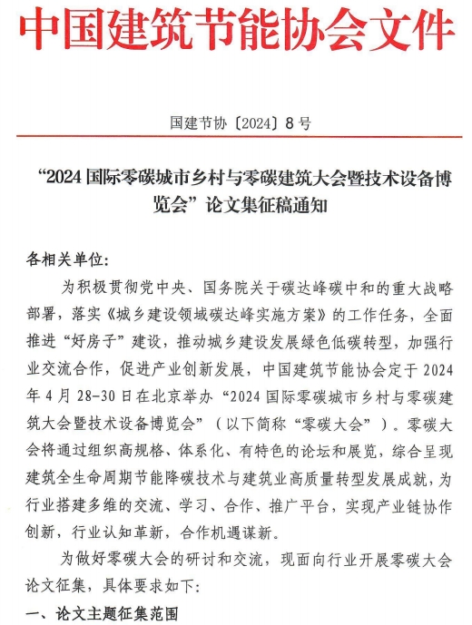 近日,中国建筑节能协会发布《关于召开“2024国际零碳城市乡村与零碳大会暨技术设备博览会”的通知》(简称《通知》)。《通知》指出,2024国际零碳城市乡村与零碳大会暨技术设备博览会定于2024年4月28-30日在北京召开,主题为“推动建筑零碳发展,促进城乡绿色低碳转型”。