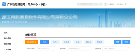 点击【单位登录】或【省政务服务网认证入口】。登录后,进入单位用户中心。可以看到【单位事项】和【人员管理】功能。