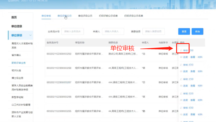 四、点击“单位审核-审核”,查看申报人材料
