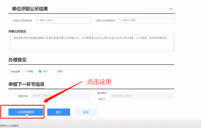 七、上传单位承诺书及审核完成信息后,审核提交选择业务:报送去向及报送单位。提交后,业务将继续在单位进行评前公示环节,打印评前公示表。(备注:公示日期不少于5个工作日)