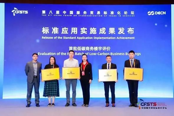 在标准应用实施成果发布环节,全国首批“低碳商务楼宇”评价标识项目正式发布,本次共有四个项目获得低碳商务楼宇评价标识,分别是上海中心大厦、北投投资大厦、联想总部东区、瑞明大厦。中国国际贸易促进委员会商业行业委员会书记任贵英、低碳智慧建筑产业技术创新战略联盟秘书长李晋秋联合为项目单位代表颁发“低碳商务楼宇”评价标识牌匾。首批项目申报单位认为“低碳商务楼宇”评价标识有助于提升自身楼宇品牌形象、增强企业信誉,并且进一步增强市场吸引力和用户满意度,提高运营效率及资产价值,降低能源消耗和运营成本。